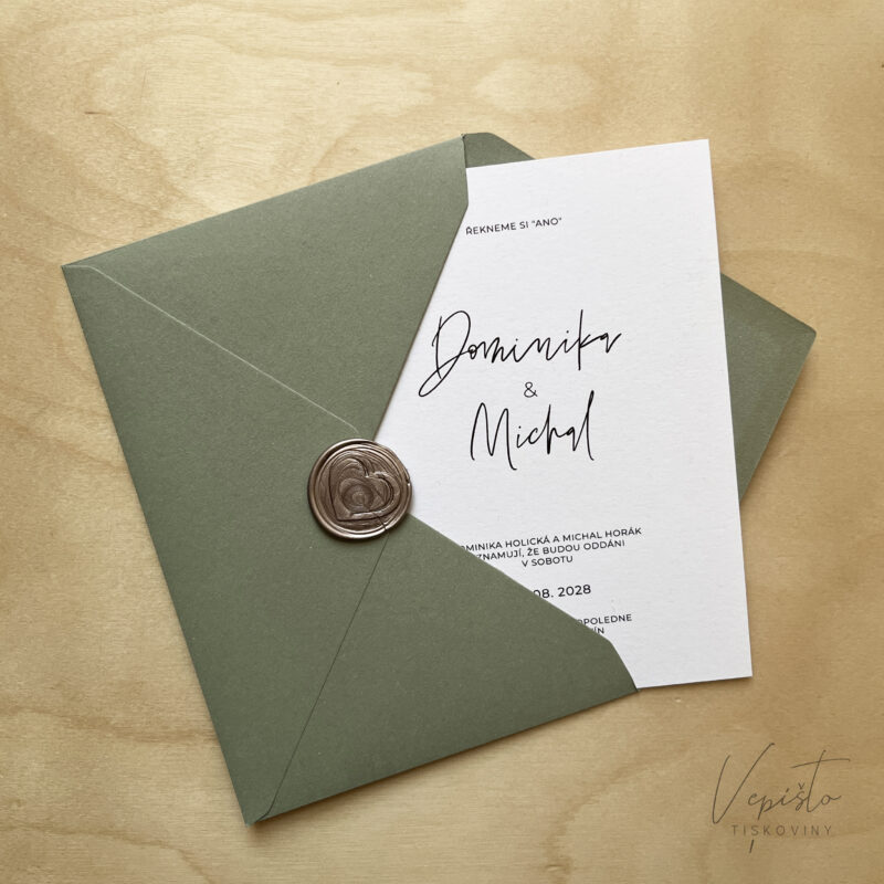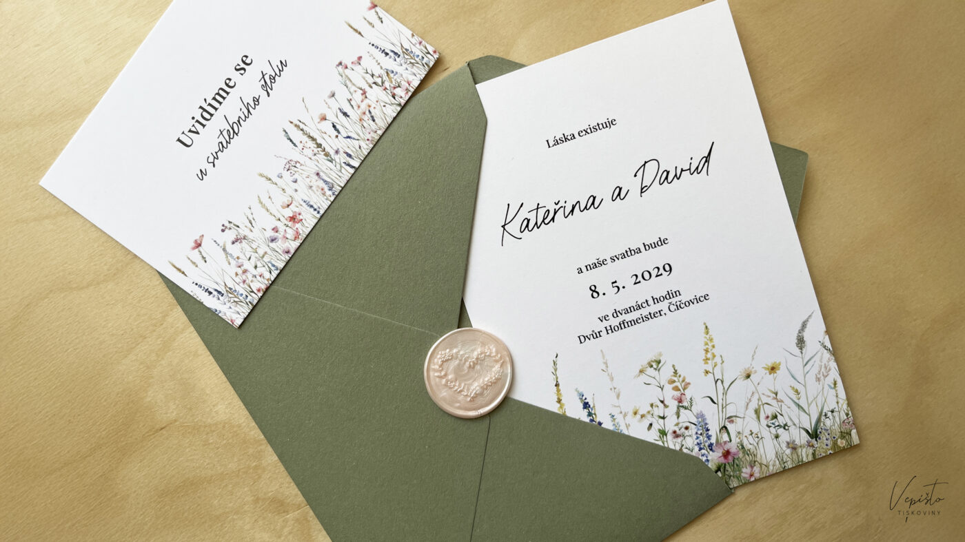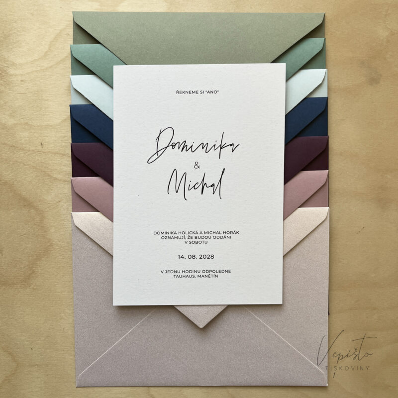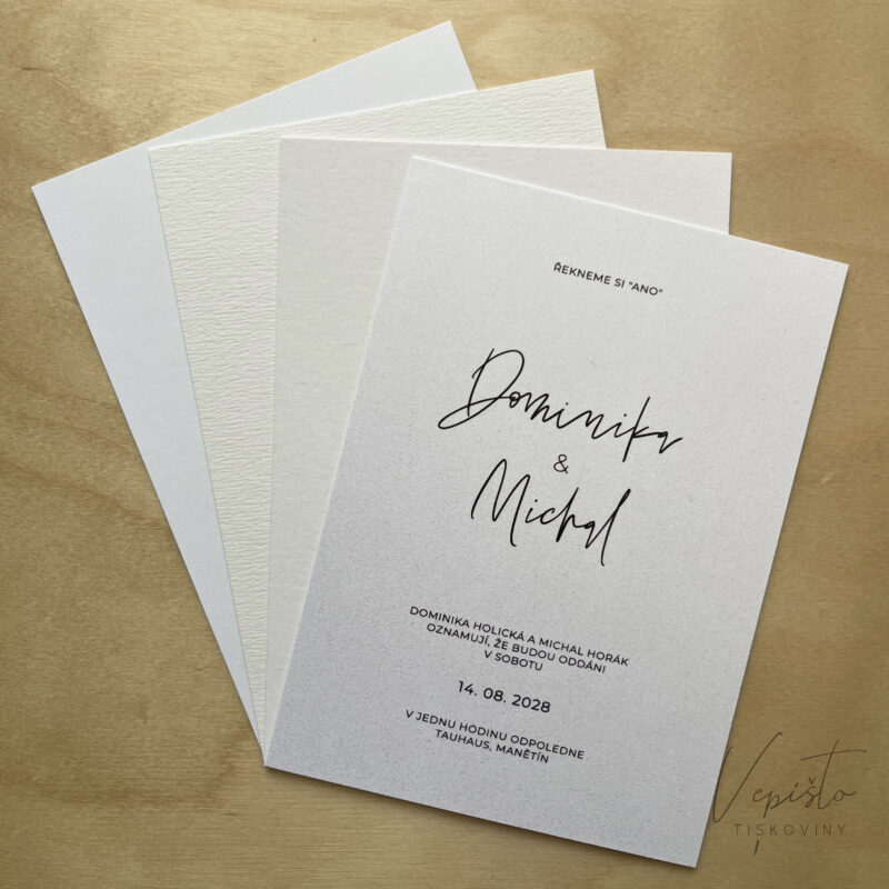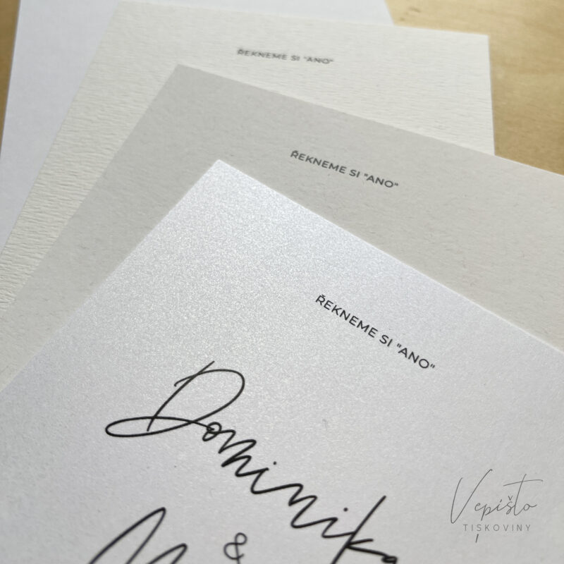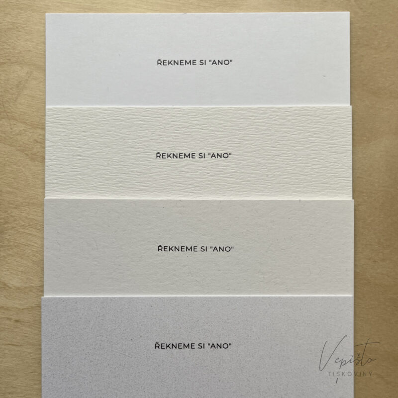 Tisknou na italské papíry Fedrigoni, které jsou jednoduše krásné. Mají čtyři druhy – hladký, strukturovaný, přírodní a perleťový, všechny o gramáži 350 g/m2. Každý z nich má jiný charakter a hodí se pro jiný styl oznámení. Moji osobní favorité jsou hladký a přírodní – působí jemně, elegantně a skvěle na nich vyniknou i ty nejmenší detaily. Kvalitní papír dělá hodně a obzvlášť to platí u minimalistických návrhů svatebních oznámení.