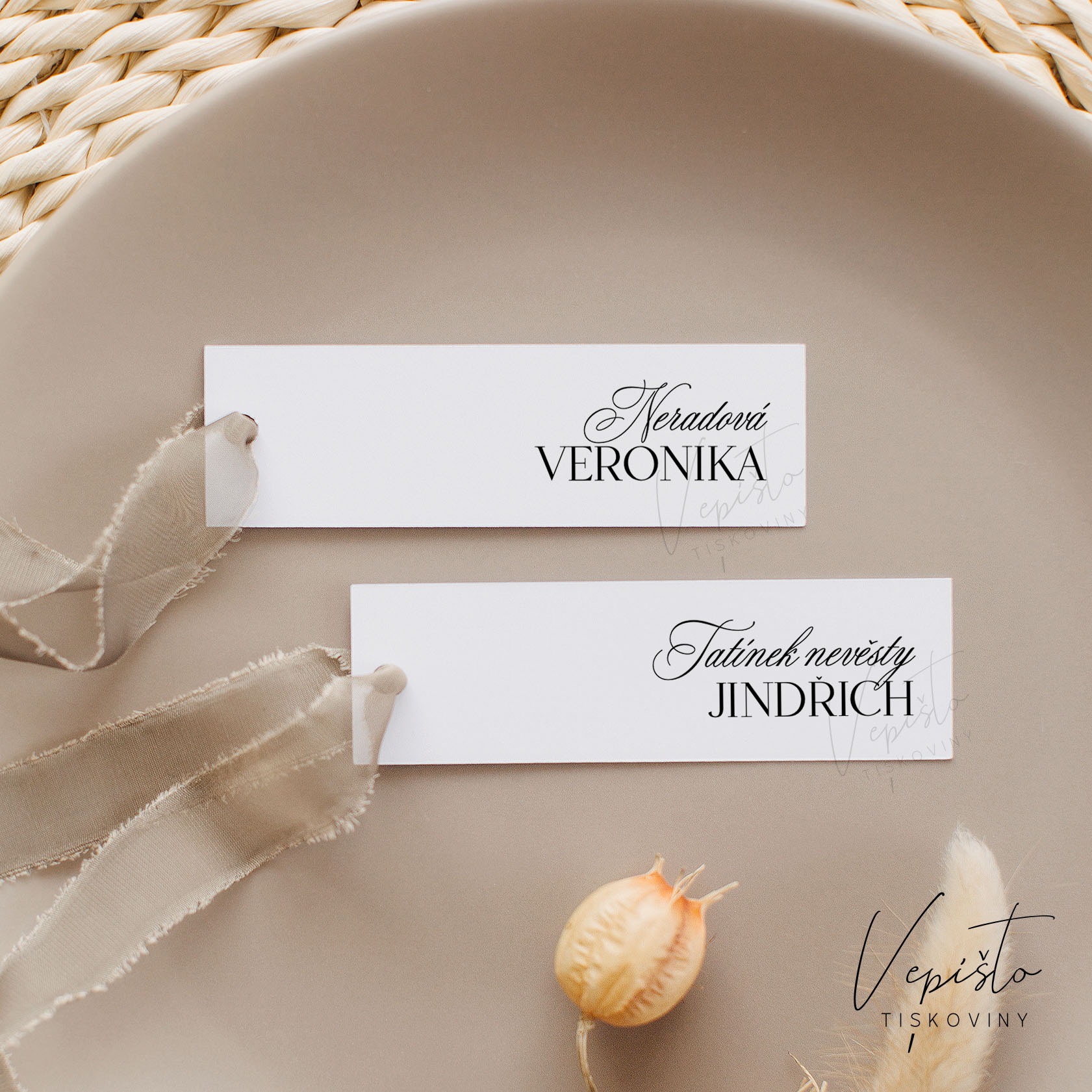 Šablona s úzkými svatebními jmenovkami je pouze ve variantě kartiček. Tyto jmenovky se hodí například k připnutí kancelářskou sponkou k menu nebo do nich udělejte dírku děrovačkou a přidělejte nějakou dekoraci, třeba proužky látky.