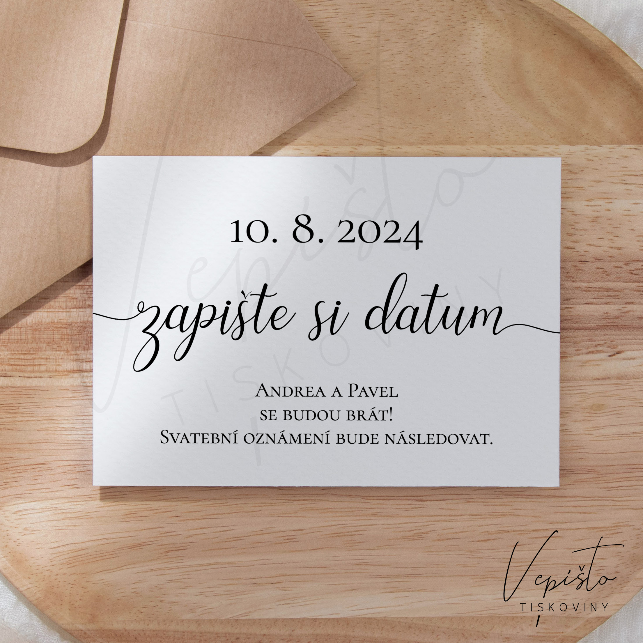 Kartička, v zahraničí známá jako “Save the date”, vám poslouží předtím, než rozdáte svatební oznámení. Rozešlete ji hostům (vytištěnou nebo elektronicky) jakmile stanovíte datum svatby, aby si dostatečně dopředu vyhradili čas a nenaplánovali si třeba letní dovolenou. Kartičky můžete vytisknout i na jiný než bílý papír, třeba hnědý kraftový.