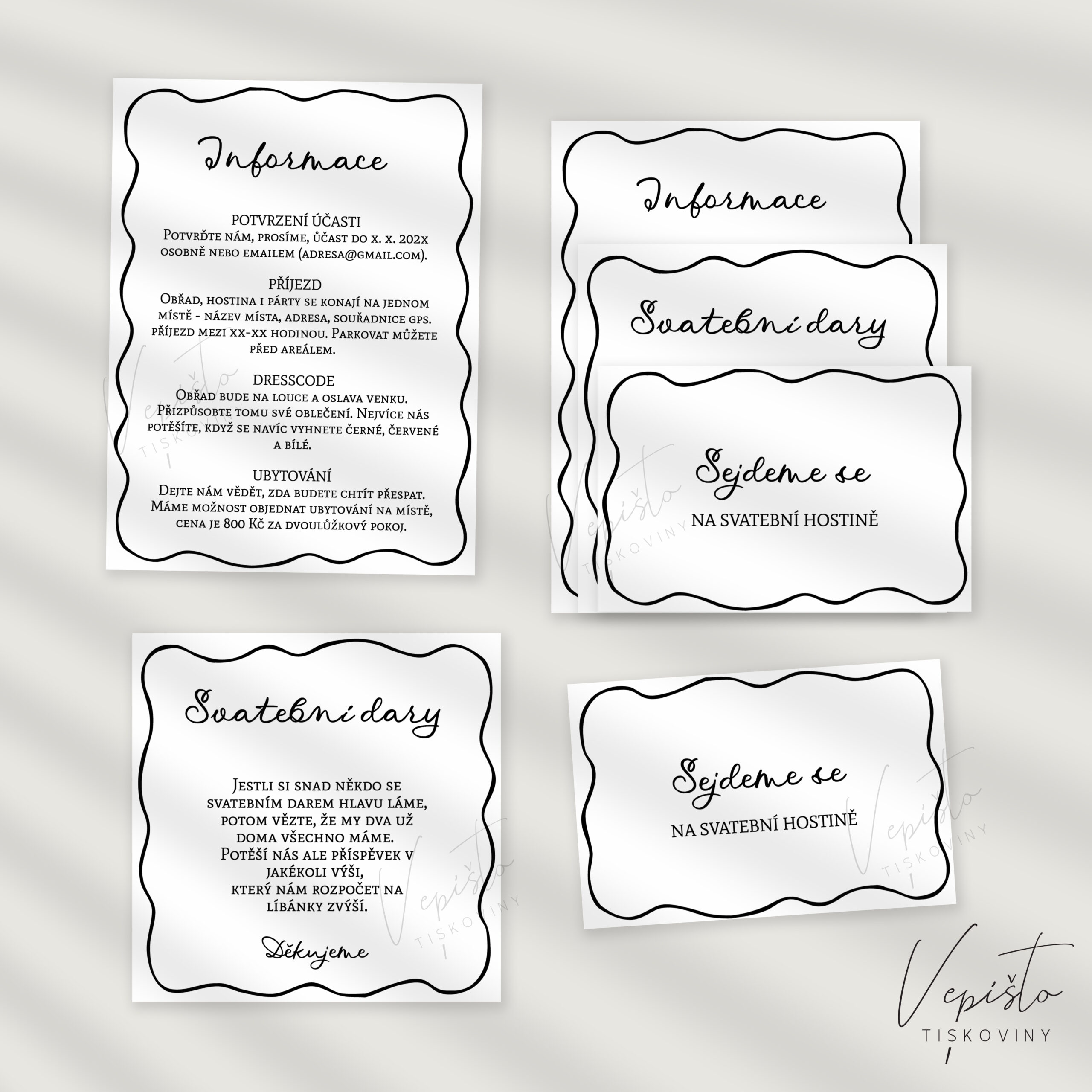 Kartičky doplní informace na vašem svatebním oznámení. Přidejte k němu detaily, informace o darech a pozvánku ke stolu, na raut nebo třeba až večerní oslavu.