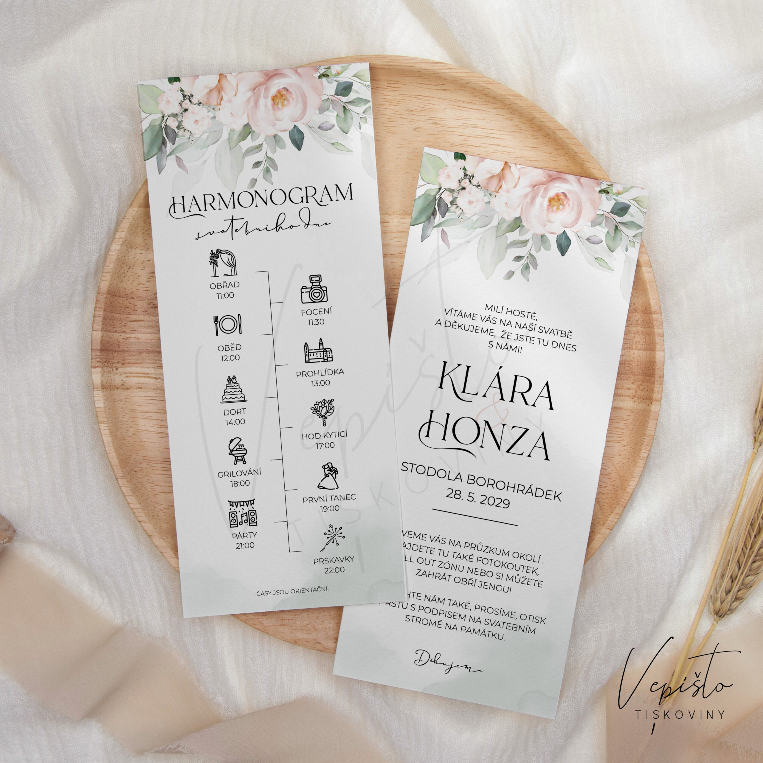 Malá verze svatebního programu, která je určena k umístění na stoly. Pokud nemáte svatební noviny, může se vám navíc hodit zadní strana, na kterou můžete napsat uvítání, poděkování či pár důležitých informací pro vaše hosty. Pokud zadní stranu nechcete použít, můžete ji vymazat.