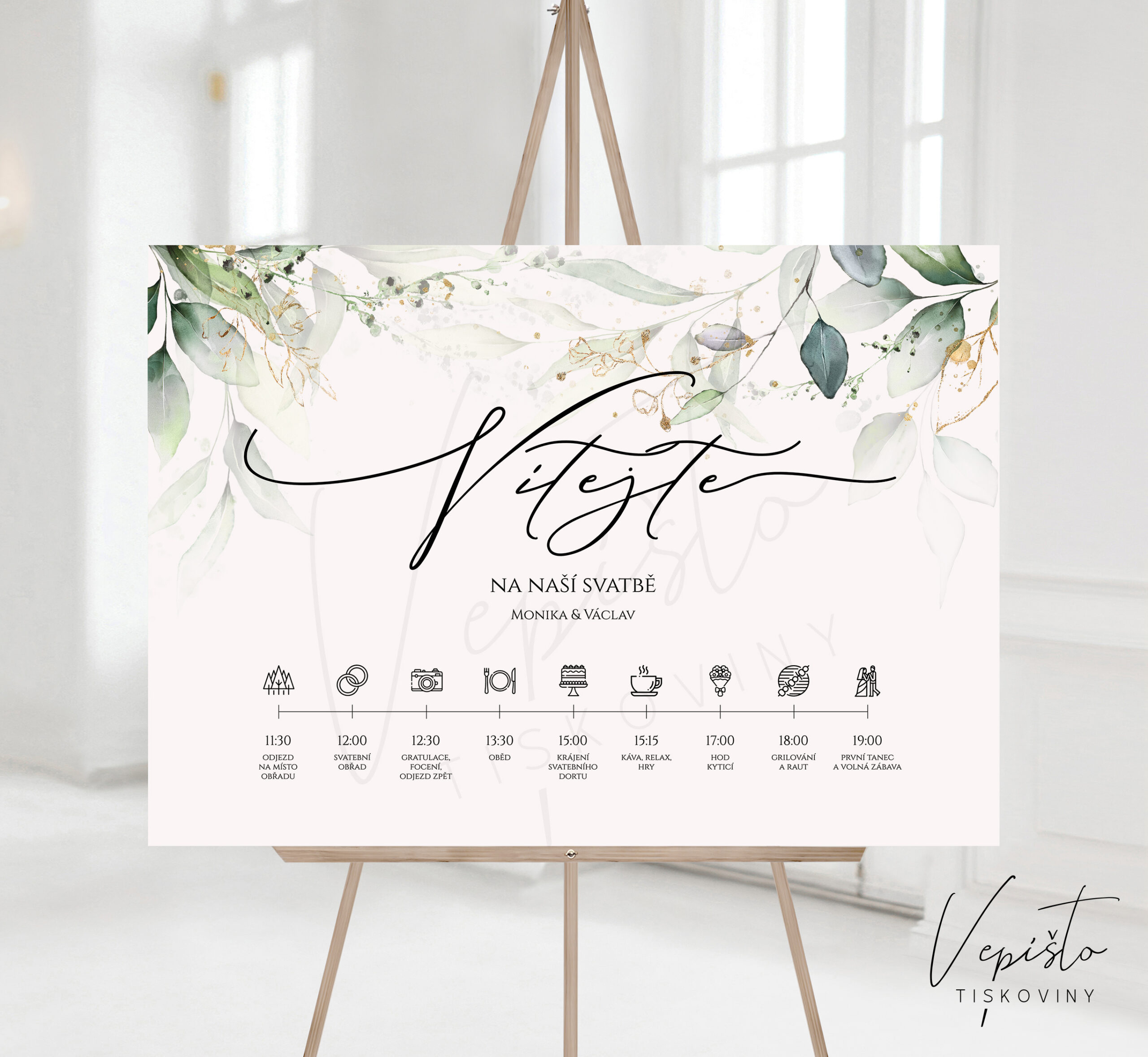 Zlaté a zelené listy, uvítací cedule s harmonogramem